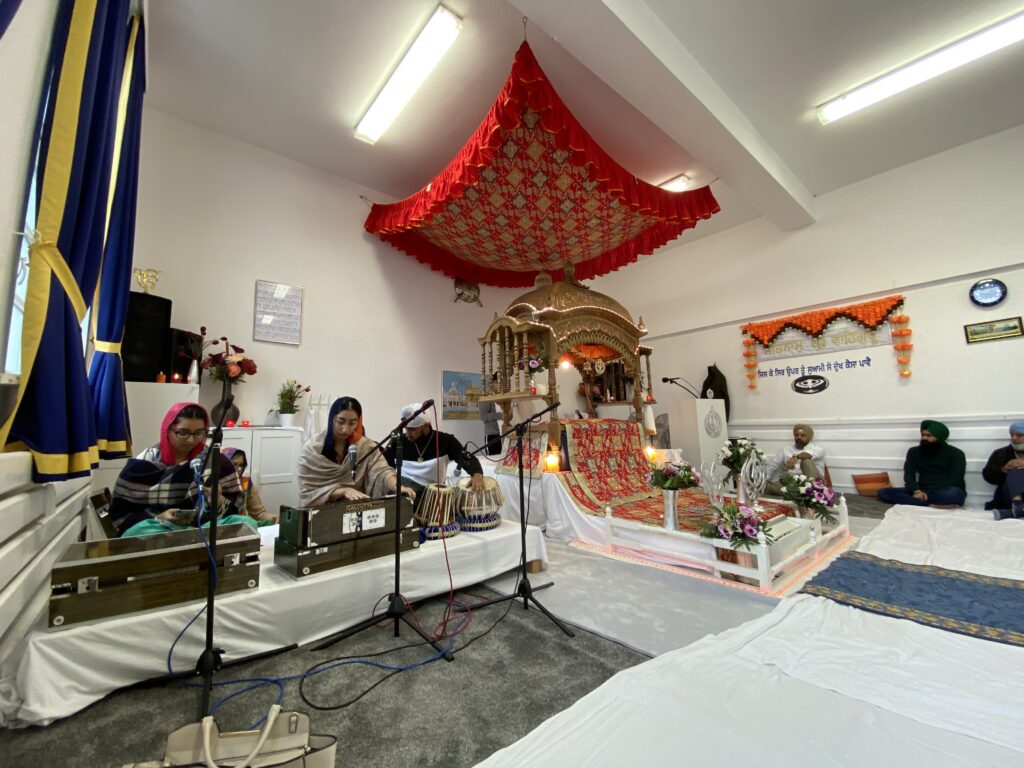 In einem Gurdwara kommt die Sangat (Gemeinschaft) zusammen, um Gottes Namen zu rezitieren, zu meditieren, Shabad Kirtan (Lobpreisungen) zu singen, die Erzählung von Überlieferungen (Katha) zu hören, Guru Granth Sahib Ji auf seinem Thron zu sehen und seine Worte (Hukam) zu hören (Darshan).